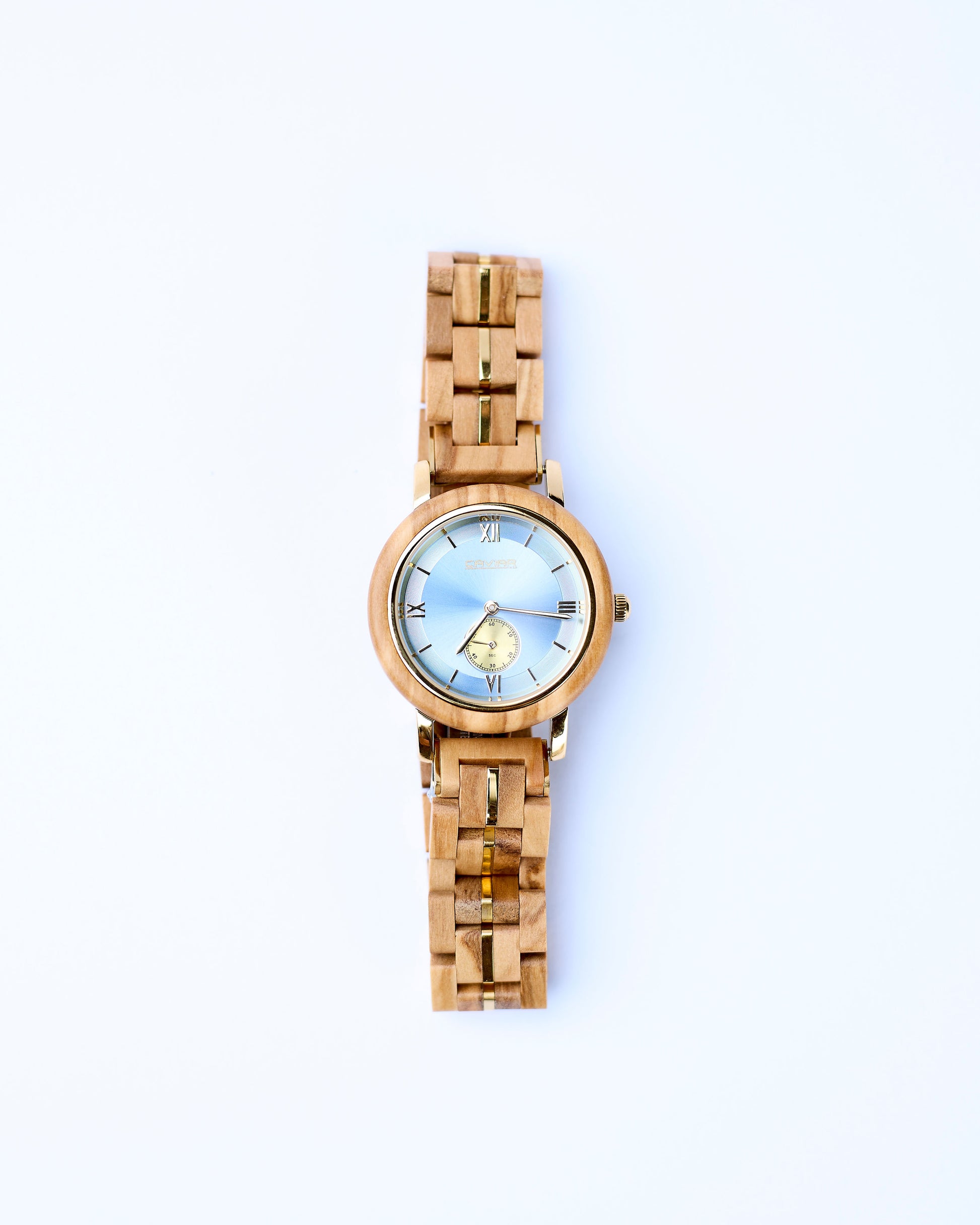 Model GT126-3A — a 34 mm women’s watch elegantly crafted from olive wood, featuring a soft light blue dial, mineral crystal glass, precise Miyota movement, and 3 ATM splash-water resistance.