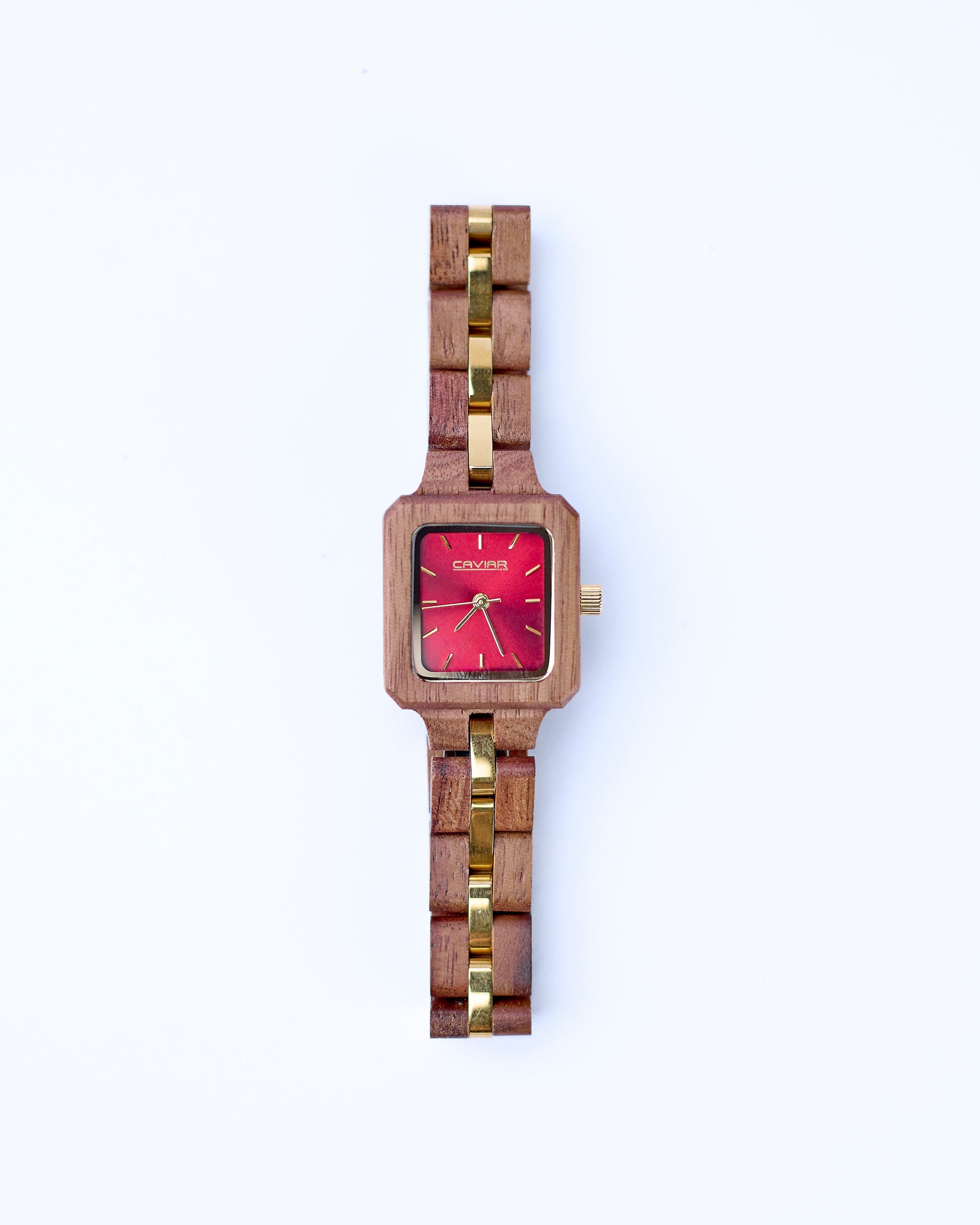 Model GT146-3A — a refined women’s timepiece in walnut wood, showcasing a vivid red dial, mineral crystal glass, precise Miyota movement, and 3 ATM splash-water resistance in a compact 27x25 mm case.